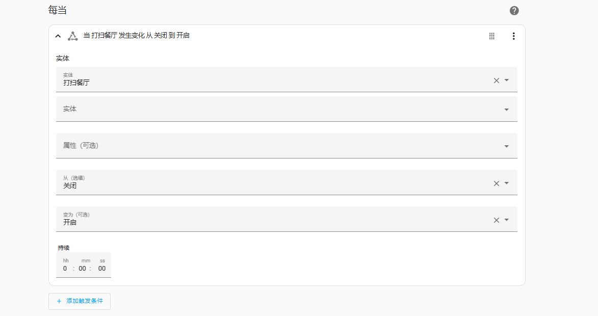 触发条件选择状态,实体选择刚才创建的辅助元素,“从”设置为“关闭”,“变为”设置为“开启”