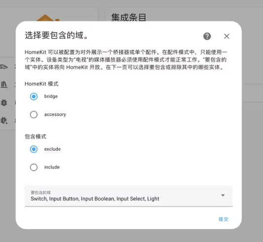 创建完成后在配置与服务中添加HomeKit bridge集成
