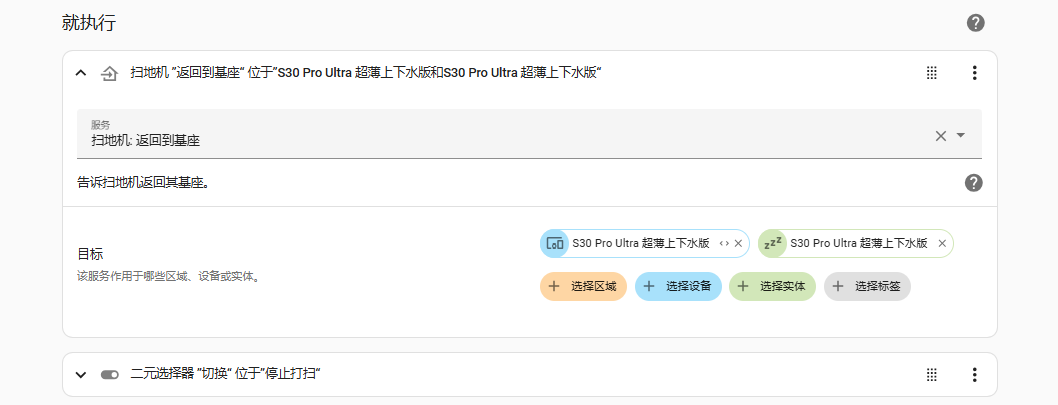 动作选择调用服务,找到dreame vacuum: clean segment(确保使用英文输入)并选择,添加设备选择使用的扫地机,并将Segments设置为对应触发条件房间的ID,再添加一个动作,选择二元选择器:切换 ,选择实体为我们刚才创建的 打扫餐厅