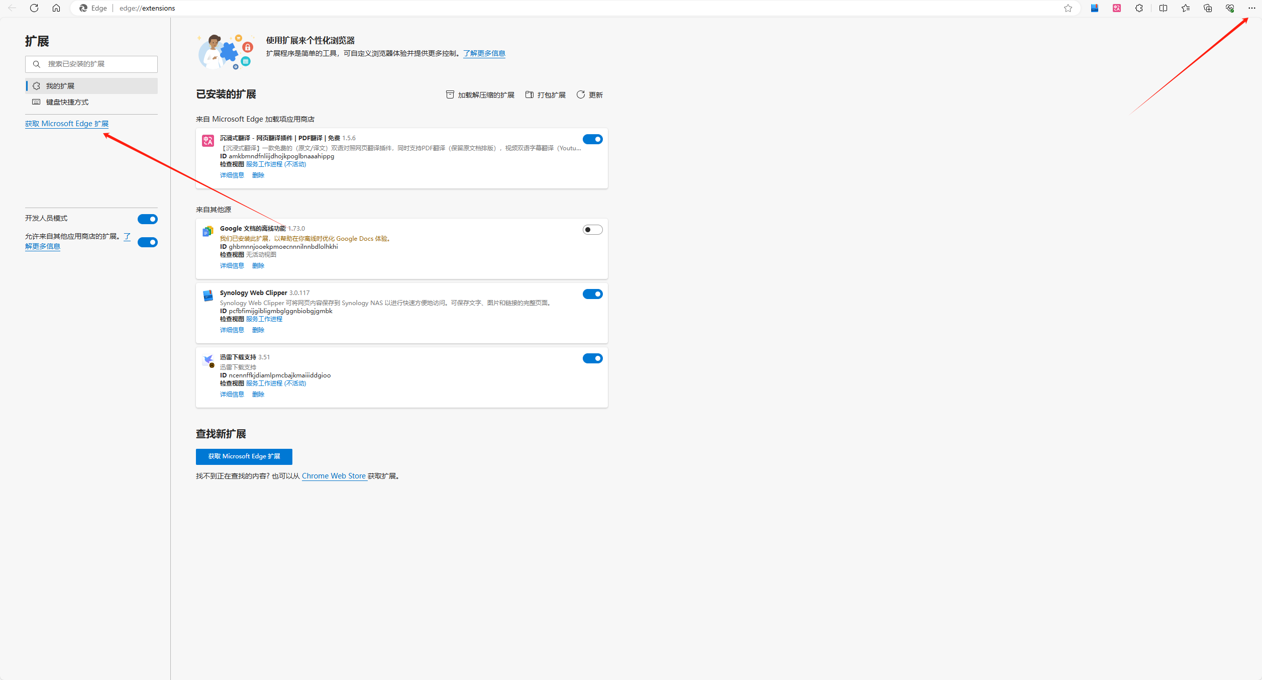 打开edge浏览器 点击右上角 ... --选择扩展-- 然后点击管理扩展--在右侧 点击 获取 Microsoft Edge 扩展 然后搜索沉浸式翻译,下载完成后启用插件